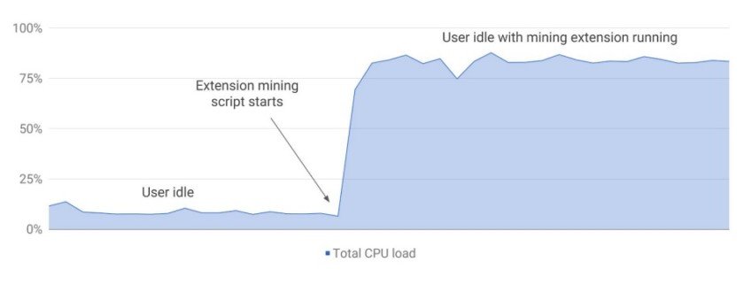 Segundo a Google as aplicações submetidas na loja da Google Chrome que possuam código escondido de mineração de moeda digital violam regras fundamentais e como tal o gigante dos motores de busca terá mão pesada. É verdade que no meio das extensões com código escondido, existem também aquelas que referem que fazem mineração. No entanto, até mesmo essas vão deixar de ser aceites e serão removidas da loja de extensões até Julho. Para que tenha um ideia do peso deste tipo de extensões na carga do processador, a Google disponibilizou a imagem que pode ver abaixo. Como vê, é sem dúvida uma enorme carga que vai atrasar e muito o seu computador.