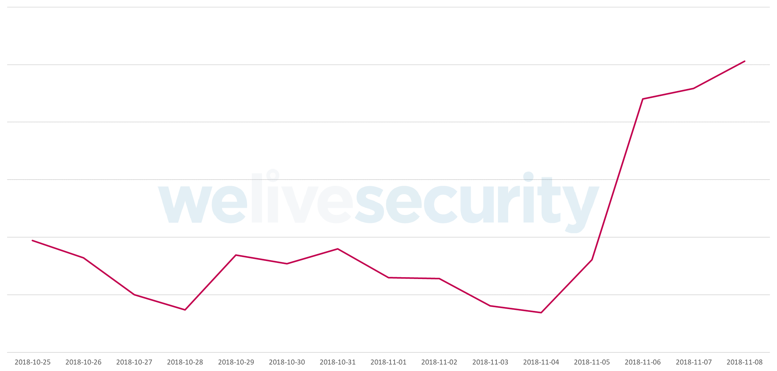De acordo com os nossos sistemas de telemetria, a mais recente atividade Emotet surgiu no dia 5 de novembro de 2018, após um período de baixa atividade. A Figura 1 revela um aumento na taxa de deteção de Emotet no início de novembro de 2018, conforme pode ser observado nos nossos dados.