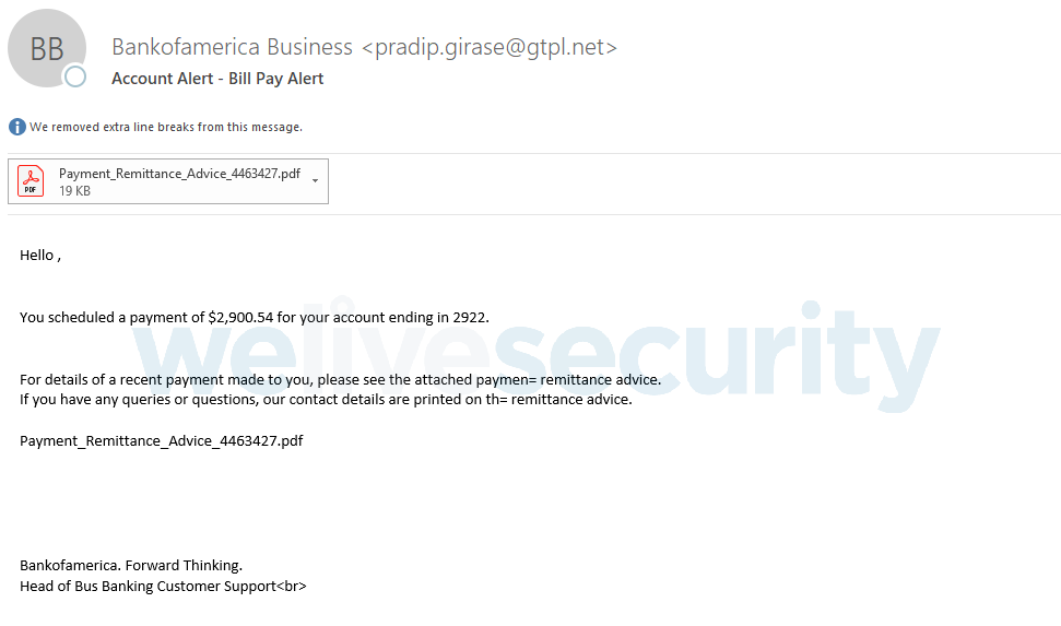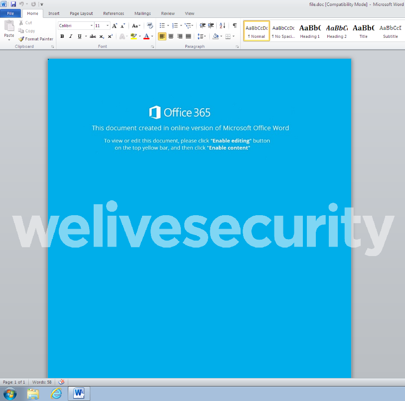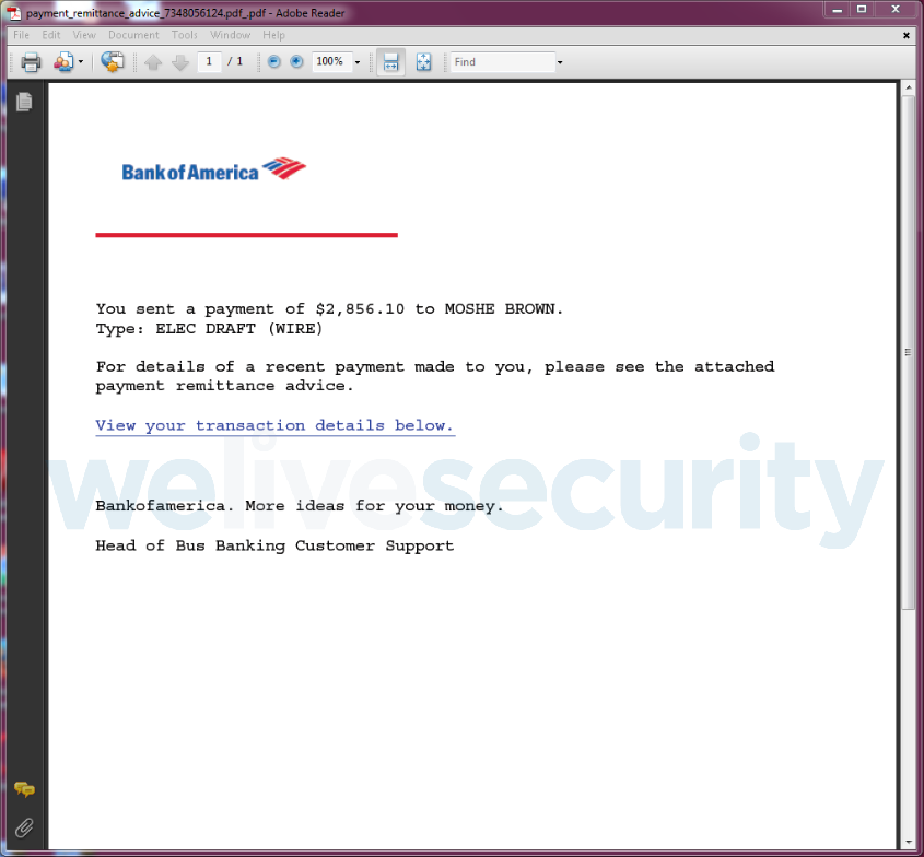 O cenário de comprometimento nesta campanha de novembro de 2018 começa com a vítima a abrir um ficheiro malicioso do Word ou um PDF anexado a um e-mail de spam aparentemente proveniente de uma organização legítima e conhecida.