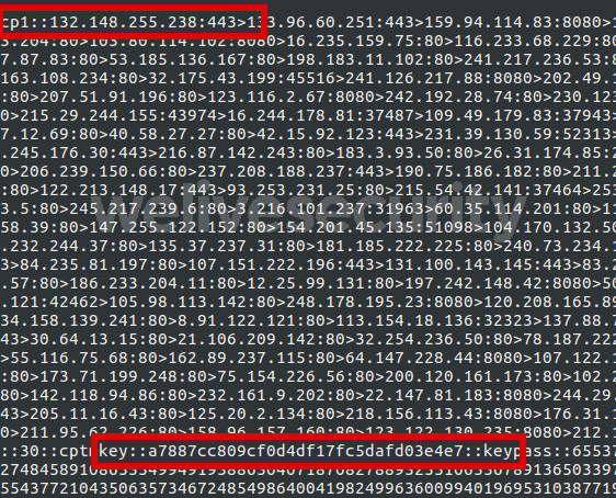 Este ficheiro de configuração contém, entre outras coisas, uma lista de servidores C&C de primeiro nível, assim como a chave RC4 necessária para as comunicações de rede.