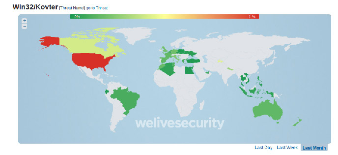 Olhando para a nossa telemetria do Kovter, podemos ver que a botnet Kovter tem como alvo principalmente a América do Norte.