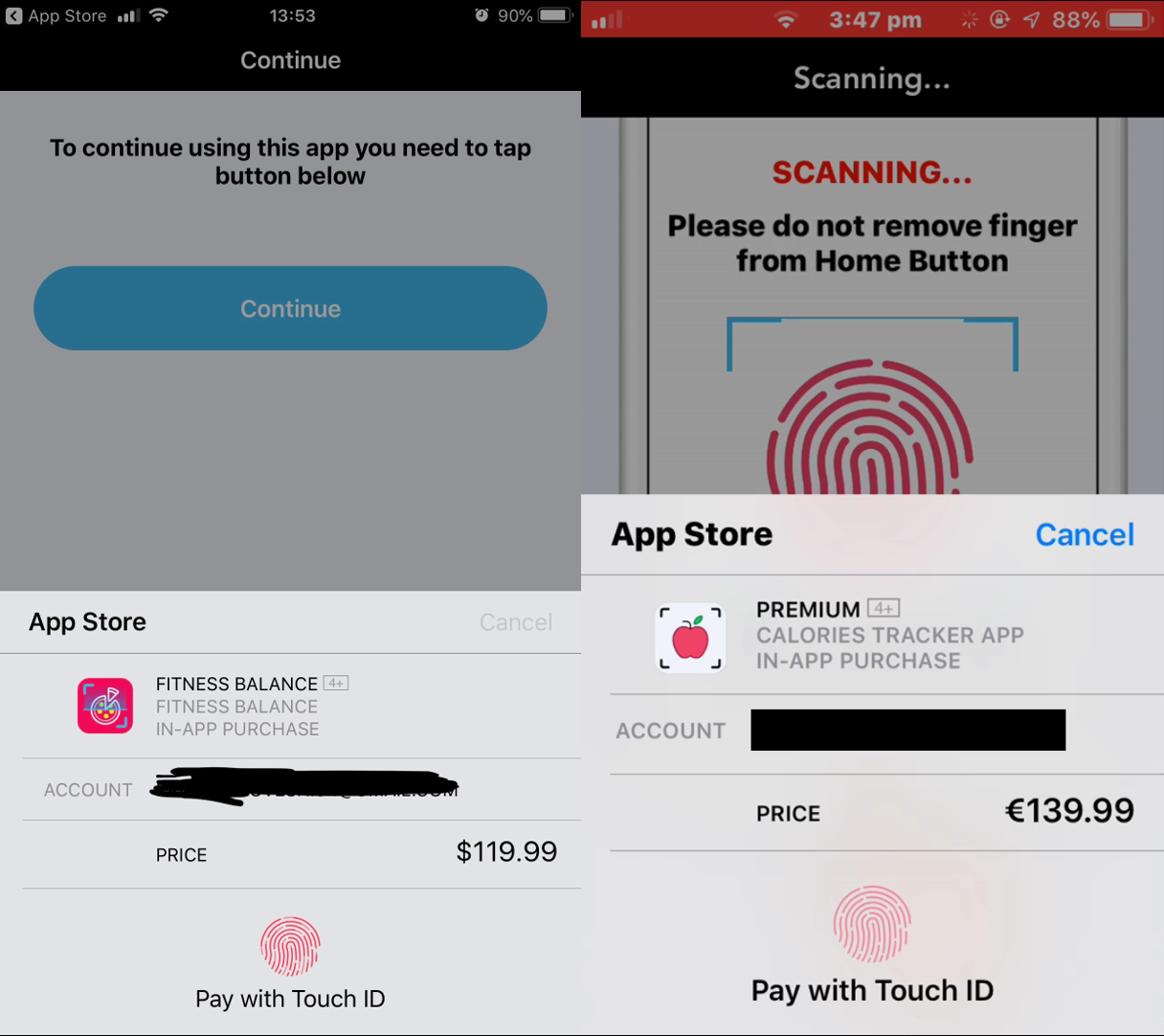 Assim que um utilizador aciona qualquer uma das aplicações pela primeira vez, elas solicitam a impressão digital para efeitos de personalização. Depois disso, estas apps abrem um pop-up com um pagamento duvidoso no valor de 99,99, 119,99 USD ou 139,99 EUR.