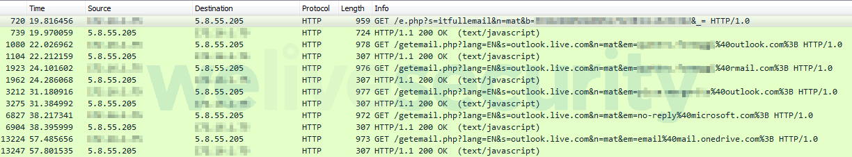 O DanaBot recolhe os endereços de e-mail das caixas de correio das vítimas. Isto é conseguido injetando um script mal-intencionado nas páginas Web dos serviços de webmail segmentados assim que a vítima faz login, processando os e-mails e enviando todos os endereços de e-mail que encontrar para um servidor C&C.