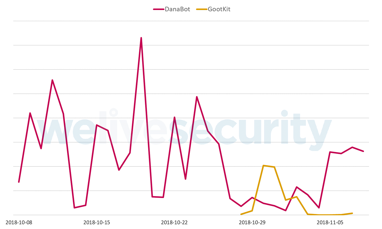 Finalmente, na semana que começou a 29 de outubro de 2018, a telemetria da ESET mostrou uma redução significativa na distribuição do DanaBot na Polónia; Na mesma semana, houve um pico de atividade do GootKit na Polónia. Durante o pico, o GootKit foi espalhado através do mesmo método de distribuição que o DanaBot utilizou nas recentes campanhas na Polónia.