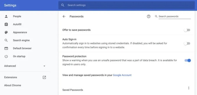 Depois de reiniciar o Chrome deve verificar as configurações em chrome://settings/passwords para ver se a proteção por palavra-passe está ativada.